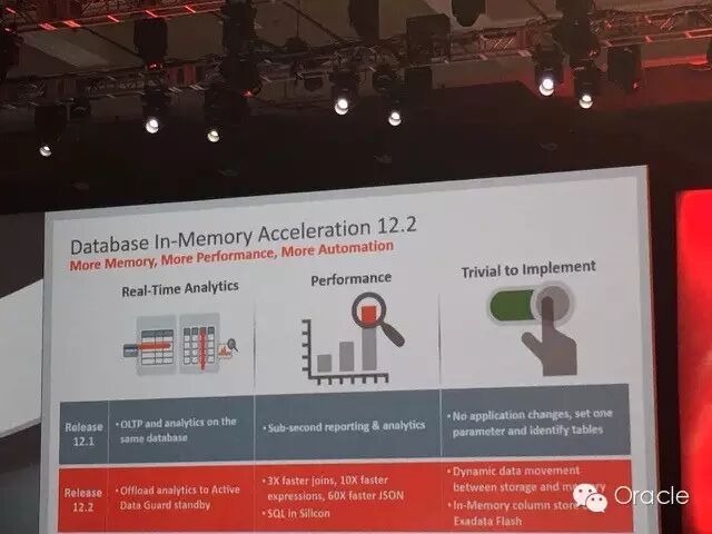 在12.2中,另外一系列的重要增强是关于In-Memory Option的。比如IMO可以用在ADG上,将读写全部分离开来,IMO在备库上进一步加速分析运算。而且从12.2开始,IMO可以将列式存储用于Flash,这将使得IMO可用的"存储"大大增加。