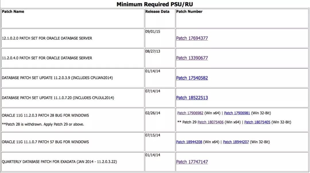 很多客户一直在提问,到底要修正什么 BUG?Oracle 在文档中没有说明,但是提出了最小补丁要求,不同版本的补丁应用矩阵: