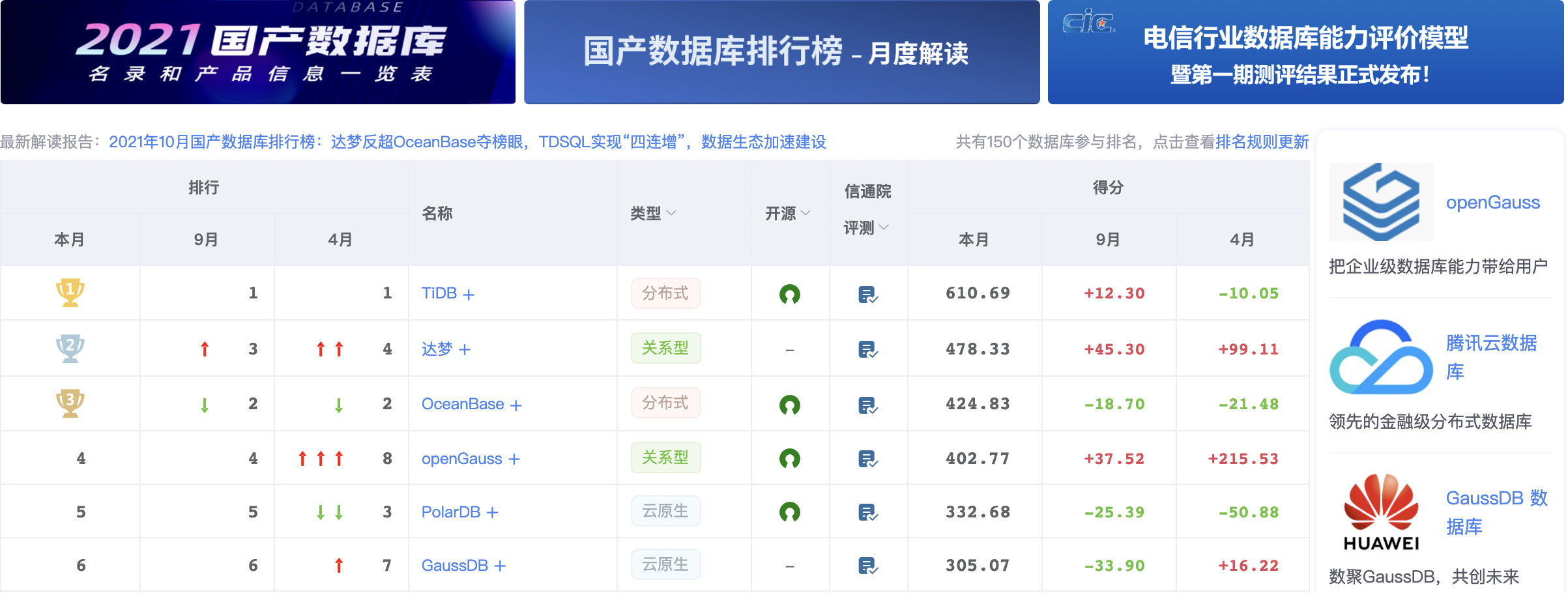 openGauss 通过一年多的开源发展,在生态社区上,取得了巨大的进步,目前在 墨天轮国产数据库流行度排行榜上位列第4名。