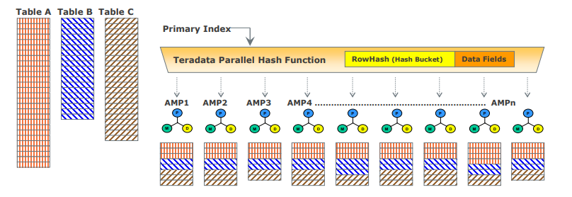 图4展示了Teradata的架构原理。图中AMP (Access Module Processor)是其核心工作单元,每个AMP拥有独立的CPU、内存和磁盘空间,互不干扰。数据表被分散存储到各个AMP节点。这种"分而治之"的思想,至今仍是高性能数据库的黄金法则。